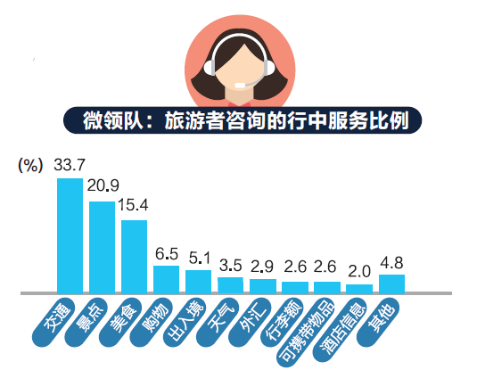 中國出境旅游者最需要哪些服務(wù)?據(jù)攜程“微領(lǐng)隊”全年大數(shù)據(jù)統(tǒng)計,用戶咨詢求助的問題一共有16類,包括旅游生活的各個方面,其中最多的是:交通33.7%、景點20.9%、美食15.4%、購物6.5%、出入境5.1%、天氣3.5%、外匯相關(guān)2.9%等。