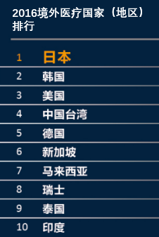 境外醫(yī)療成為繼“出國爆買”之后我國游客的新風(fēng)尚。我國大量富裕階層不惜花費重金選擇境外醫(yī)療旅游。2016年通過攜程報名參加出境體檢等醫(yī)療旅游人數(shù)是前一年的5倍,人均訂單費用超過5萬元。根據(jù)網(wǎng)上預(yù)訂與瀏覽數(shù)據(jù),報告發(fā)布了海外醫(yī)療旅游最受歡迎的10大目的地國家和地區(qū)是:日本、韓國、美國、中國臺灣、德國、新加坡、馬來西亞、瑞士、泰國、印度。