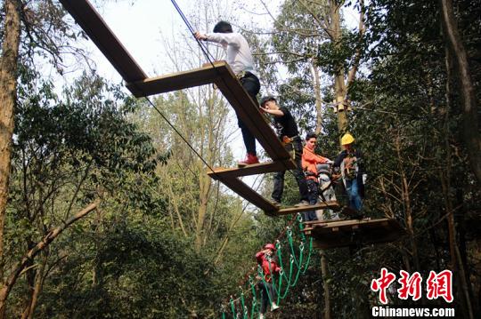 3月8日,游客正在體驗剛開放的飛越叢林樹上探險項目。經(jīng)過兩年的建設(shè)籌備與試營運,長沙飛越叢林戶外冒險樂園將于3月15日在湖南長沙大明山莊正式開園。據(jù)了解,這是“飛越叢林”繼福州、重慶、成都之后中國第四家,也是華中地區(qū)首家叢林冒險樂園。
