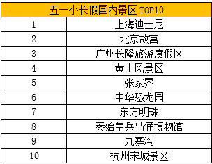 五一出游,哪些景區最受游客喜愛?攜程大數據顯示,截至目前,在五一小長假十大熱門景區排行中,包括上海迪士尼、北京故宮、廣州長隆旅游度假區、黃山風景區、張家界、中華恐龍園、東方明珠、秦始皇兵馬俑博物館、九寨溝、杭州宋城景區等在內的十個景區上榜。