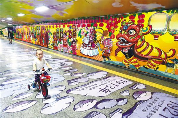 據越秀區商務局(旅游局)商貿旅游科科長李靜介紹,廣州古城游體驗館是對越秀全域旅游的創新宣傳。體驗館空間占地總面積1400多平方米,共有6個出口,其中3個出口設計了獨特的“廣州古城游”門頭。體驗館借用內部地形曲折綿長的特點,在長達千米的地鐵站人行通道墻上,用生動的手繪畫創意性地展示了越秀的歷史人文特色和旅游資源。