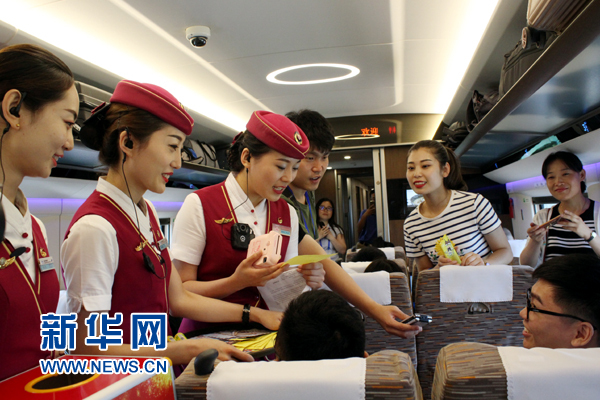 為慶祝“復興號”列車首發,G123列車長帶領團隊在車內舉辦有獎竟猜活動,旅客積極參與。 新華網 郭香玉 攝