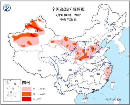 預計,7月9日白天,內蒙古西部、甘肅北部、寧夏北部、陜西中部、山西中南部、河北中南部、山東西北部、河南西北部、新疆西北部和南疆盆地等地有35℃以上的高溫天氣,其中,河北南部、山西西南部、陜西關中地區(qū)、新疆西北部和南疆盆地等地的部分地區(qū)最高氣溫可達37~39℃,局地可超過40℃。