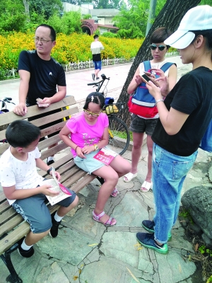圖中黑衣服白帽子的女孩,自稱是“學生導游”,匆匆帶著游覽完畢后,兜售《學習方法》小冊子,家長紛紛掏錢。