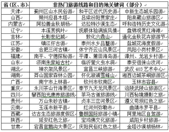 《假日旅游指南》中提示游客,多數國內熱門旅游目的地假日旅游接待人次呈現出“中間高,兩頭低”的趨勢,假日前兩日或者最后兩日安排一次短途旅游將使旅途擁堵有所緩解,如前往預計較熱門的地區,可安排假日前提前一天出行。同時,臨近假日,各地交通部門將發布路網提示,預測、監測公路擁堵情況,廣大自駕游客可予以關注,科學選擇行車路線。長途出行,假日前幾天前往較大城市、后幾天前往中小城市的鐵路、民航線路相對寬松,可避開客運高峰。此外,一些新興的旅游線路和目的地未受到較多關注,部分熱門的旅游線路和目的地進入相對淡季,在假日期間選擇前往將大大提升旅游的品質,豐富旅行的內涵。為方便廣大游客,部分省(市、區)旅游主管部門根據歷年同期假日旅游情況,整理了一份非熱門旅游線路和目的地關鍵詞,以供參考。