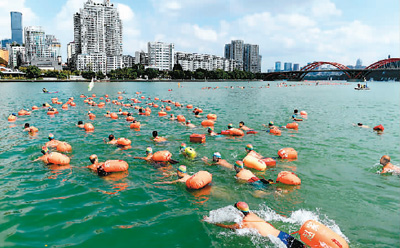 10月2日,來自全國各地數千名游泳愛好者齊聚廣西柳江暢游。