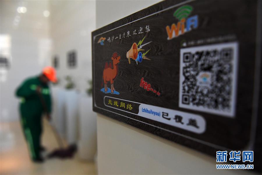 敦煌鳴沙山月牙泉景區(qū)衛(wèi)生間里張貼著醒目的無線WIFI提示牌(12月3日攝)。新華社記者 陳斌 攝 -