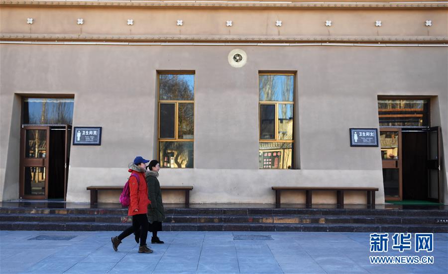 12月3日,游客從敦煌鳴沙山月牙泉景區(qū)內一處衛(wèi)生間前走過。新華社記者 陳斌 攝 -