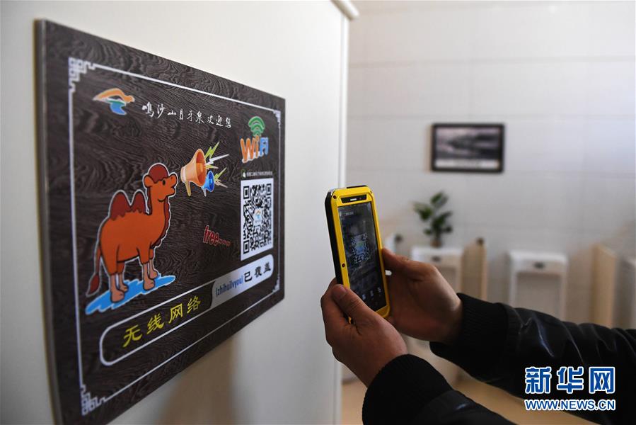 12月3日,游客在敦煌鳴沙山月牙泉景區(qū)衛(wèi)生間里用手機掃二維碼上網。新華社記者 陳斌 攝