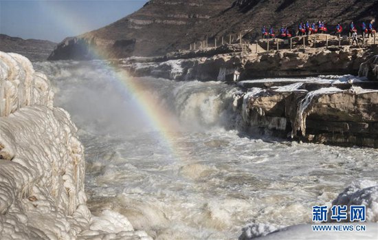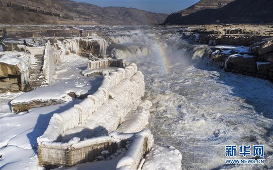 當日,位于秦晉大峽谷的黃河壺口瀑布氣溫已降至零下10℃,晶瑩剔透的冰掛與瀑布上空的彩虹交相輝映,景象甚為壯觀。