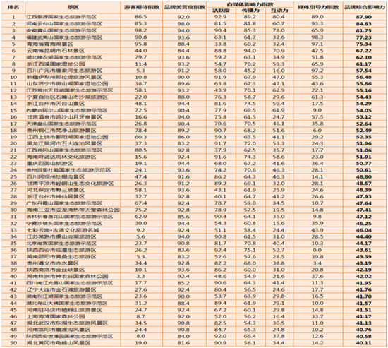 為全面評估國家生態旅游示范區品牌影響力,人民網輿情監測室旅游大數據中心發布2017年度中國生態旅游示范區排行榜(Top50)。榜單以國家生態旅游示范區游客期待程度、旅游目的地好評度、媒體報道影響以及官方認證微博、微信為評價對象,綜合考察游客期待指數、品牌美譽度指數、媒體引導力以及自媒體影響力(活躍度、傳播力和互動力)四個維度。通過海量數據分析和數理模型計算,全面呈現國家生態旅游示范區品牌綜合影響力的發展現狀。