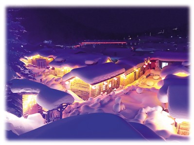 一入雪鄉,獨具特色的房子便映入眼簾。層層疊疊的白雪從房頂順著屋檐一直垂到地上;潔白如玉的雪地上冒出一朵朵矮矮胖胖的雪蘑菇,如同天上的云朵掉落人間,輕盈可愛。雪鄉天黑得很早,晚上四五點時家家戶戶便點亮高掛的紅燈籠,整個村子像被施了魔法,變身為童話王國,眼前的世界滿足了兒時我們對童話世界的所有幻想。三個小伙伴激動地除了“哇”,什么都說不出,大自然的鬼斧神工無需半點修飾就已美得不可方物。