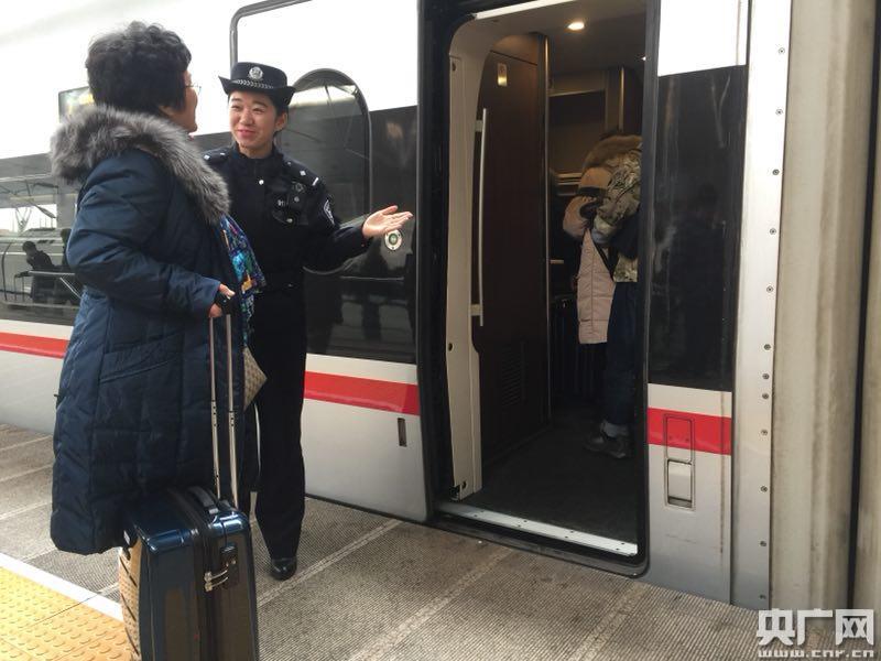 央廣網(wǎng)北京1月23日消息 “你好,受累看一下我是坐這趟車嗎?”“阿姨您好,您的車票上是G1次列車,小心站臺與列車的空隙,慢點上車……”2018年1月22日上午8時45分,由天津鐵路公安處乘警支隊擔當值乘的G1次列車上,即將迎來乘警生涯春運首秀的劉曉燕,有條不紊的組織旅客乘降,迎接旅客上車。