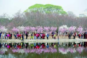 昨天一早,園內素有“報春”美名的杭州早櫻已悄然綻放,這預示著一年一度的櫻花節正式拉開帷幕。公園內30余種近3000株櫻花將陸續綻放,另外,園內12000余株迎春、梅花、連翹、山碧桃、榆葉梅、海棠等花木,花毛茛、角堇、虞美人等16個品種4萬余盆一二年生草花也相繼盛開。