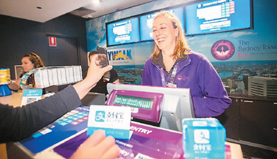 中國游客在澳大利亞悉尼的景點使用支付寶購買門票。