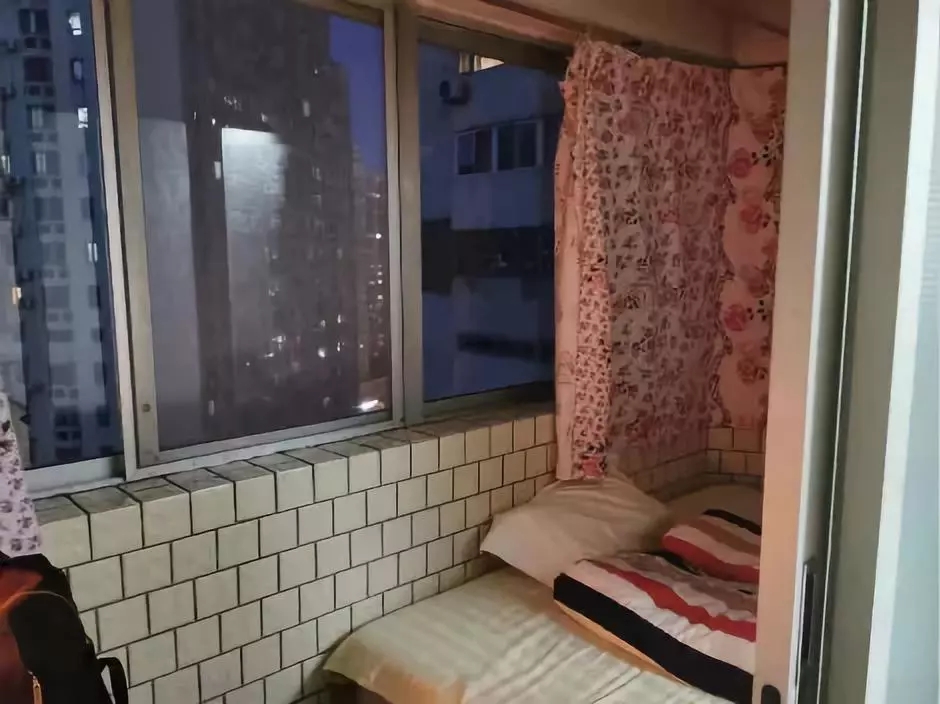 10月末的一晚,最低溫度5攝氏度。當記者推開預訂好的“經濟間”房門時,發現居然是個陽臺。房間內,床和小桌子緊貼兩側墻壁放置,中間僅有一人站立的空間,天花板上還掛著晾衣桿,陽臺和客廳間的門無法上鎖。
