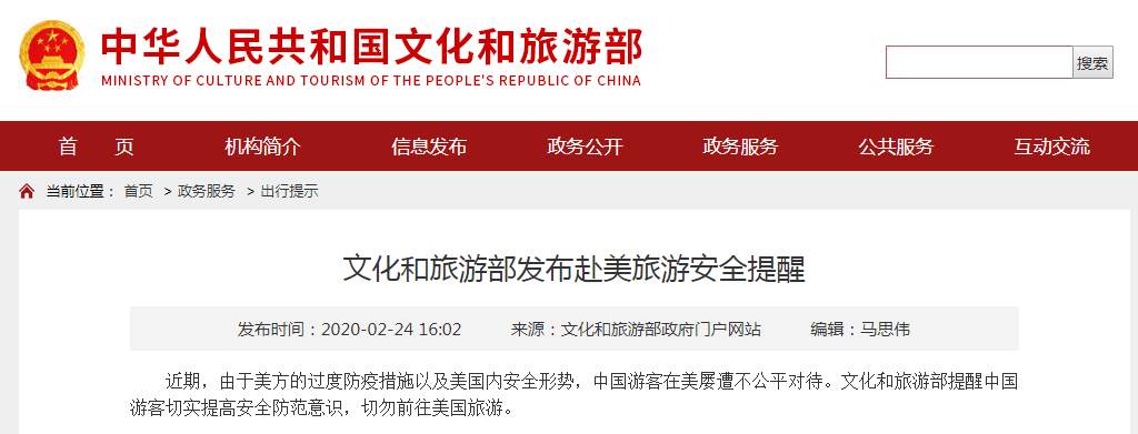 2月24日,文旅部網站刊發赴美旅游安全提醒,稱近期由于美方的過度防疫措施以及美國內安全形勢,中國游客在美屢遭不公平對待。文化和旅游部提醒中國游客切實提高安全防范意識,切勿前往美國旅游。