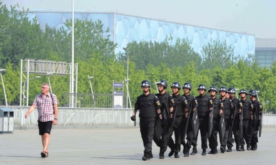 安保人員在水立方附近巡邏。