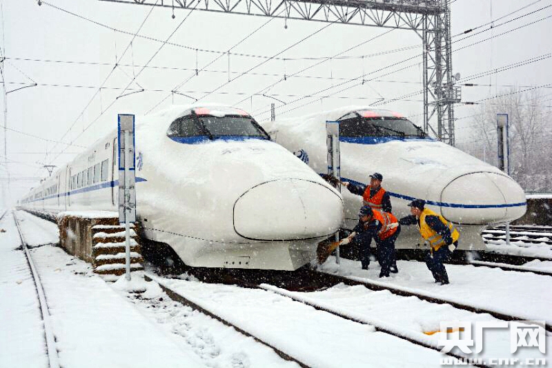 2018年1月4日,合肥南動車運用所內,職工正在為即將上線運行的動車組進行掃雪除冰。(央廣網發 謝冰飛攝) 央廣網北京1月5日消息(記者何微)4日,由于大范圍、高強度的降雪,不少地區的鐵路運輸受到不同程度影響。多地列車出現延誤和停運情況,京廣、鄭徐、鄭西、西成等部分線路采取限速運行措施。影響范圍覆蓋湖北、河南、安徽、江蘇、陜西、四川等地。有計劃乘火車去往或途經上述地區的乘客請密切注意鐵路部門的信息公告。鐵路部門已經啟動應急預案,組織數萬名鐵路干部職工掃冰除雪,努力確保旅客出行安全暢通。 -