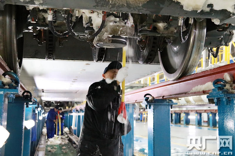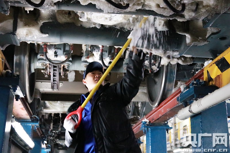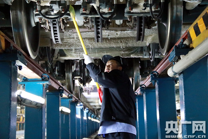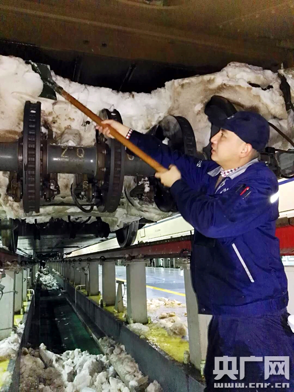 2018年1月4日 中國鐵路北京局集團公司北京動車段,職工正在進行動車組列車底部的掃雪除冰作用。(央廣網發 高悅攝) -