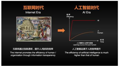 亞當斯密在國富論開篇即提到,財富積累來自社會分工和效率提升。而王小川認為,互聯網時代與人工智能時代的一大區別,即在于效率提升,這也是人工智能發展給人類社會帶來的影響之一。“在互聯網時代,我們通過‘連接’使得信息更加透明,從而促進人類社會分工,提升效率;而在人工智能時代,則是因為機器能夠比人更有效率地去學習,使得我們的商業效率得到極大的提升,比如利用AI的能力,在金融、醫療、智能硬件中替代部分人類的工作”。