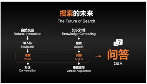 王小川進一步談到在自然交互和知識計算領域,產品如何進行應用落地。他以搜狗的產品為例進行解讀,“搜狗有兩個核心產品,一個是輸入法,一個是搜索引擎。隨著人工智能的到來,也分別有相應的突破:在自然交互里面,輸入法會變成語音輸入,然后走向對話;另一方面是搜索,作為知識計算的引擎,走向問答”。