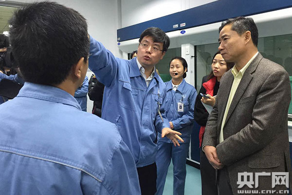 工業和信息化部副部長辛國斌(右一)在九江石化總經理覃偉中(左二)的陪同下,參觀九江石化工廠。央廣網記者高藝寧_攝