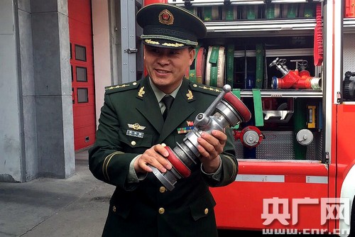 海淀消防支隊(duì)雙榆樹(shù)中隊(duì)指導(dǎo)員戴亞強(qiáng)介紹消防設(shè)備 央廣網(wǎng)記者高藝寧攝