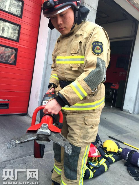 海淀消防支隊(duì)雙榆樹(shù)中隊(duì)副中隊(duì)長(zhǎng)李澤宇演示消防破拆工具 央廣網(wǎng)記者高藝寧攝