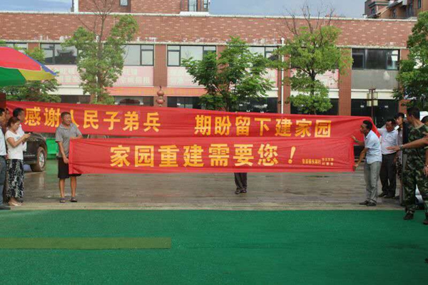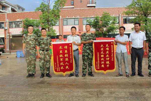 8月9日下午17時40分,在武警水電二支隊安徽東至縣搶險臨時營區門口,十幾名當地受災群眾拉起了“感謝人民子弟兵,期盼留下建家園”“家園重建需要您”等橫幅,送來了“情系張溪人民,盡顯鐵軍風采”“危難關頭伸援手,大愛無疆戰洪魔”兩面錦旗,到部隊“請愿”,請求官兵們留下來,繼續幫助當地搞好災后重建。