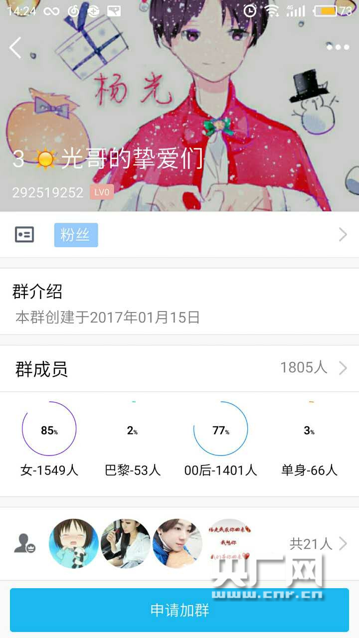 記者轉(zhuǎn)變方式,想要加入粉絲群側(cè)面了解情況,但直至截稿前也未得到同意進入該群。記者通過查看群資料發(fā)現(xiàn),這個粉絲群共1805名成員,其中女性占85%,共1549人,“00后”占77%,共記1401人。