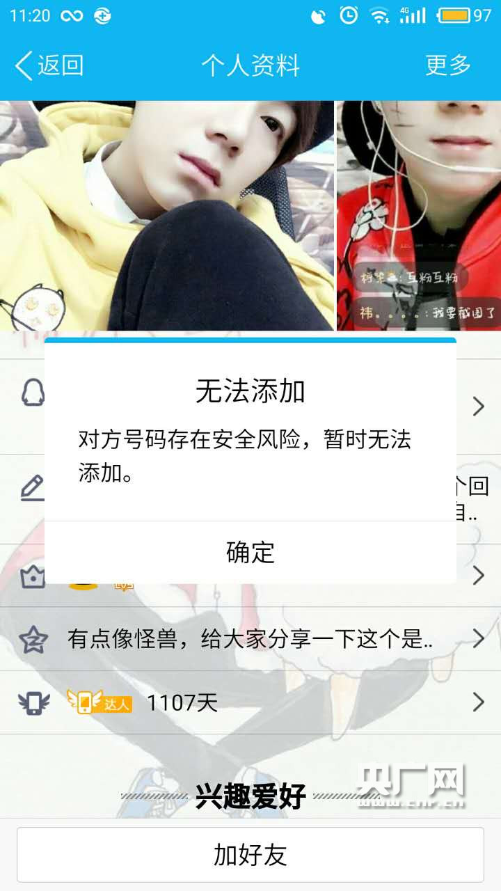 從2月7日上午10時至今日截稿前,記者不斷通過QQ,微信、全民K歌私信、微博私信、想與主播“楊光”取得聯(lián)系,但都未成功。記者試圖添加楊光的QQ號時,彈窗出現(xiàn)“賬號顯示存在安全風(fēng)險暫時無法添加”的字樣。