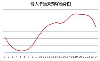 同時,情人節當天,從分時預訂情況來看,從早上8點開始酒店訂單量已有明顯增長,下午三點出現小波谷,在晚上6點又達到峰值,這與情人節當天為工作日,多數情侶一般從下午三點開始準備,等六點下班先在微信訂好酒店再進行別的情人節項目有關。