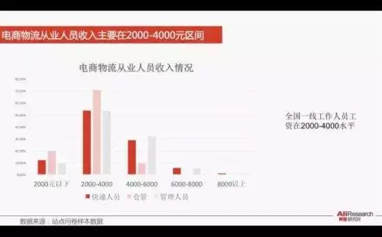 2016年5月,北京交通大學(xué)、阿里巴巴研究院、菜鳥網(wǎng)絡(luò)聯(lián)合發(fā)布《全國社會化電商物流從業(yè)人員研究報告》顯示,53.4%的快遞站點員工月平均工資在2000-4000元;近八成一線快遞員日均工作9-10小時,有些甚至12小時以上。