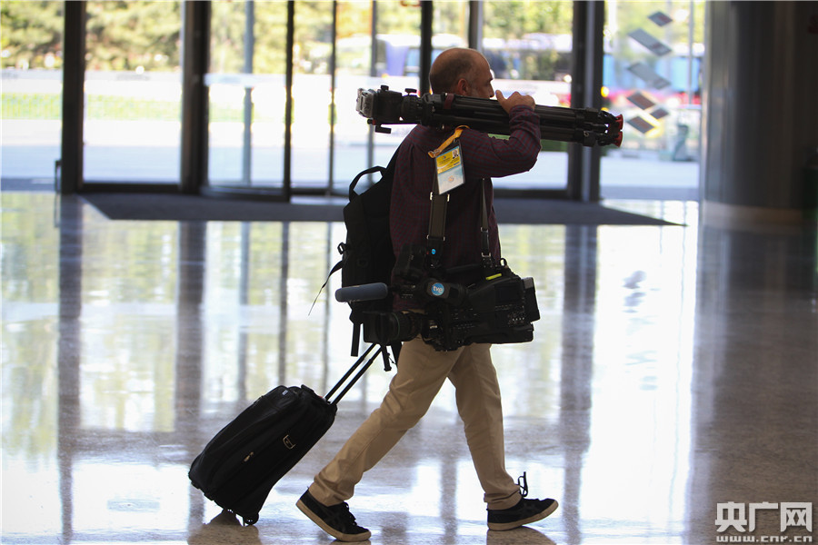 在“一帶一路”國際合作高峰論壇新聞中心內,一位記者離開會場。(央廣網記者 王永康 攝) -