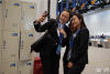 在“一帶一路”國際合作高峰論壇新聞中心內,兩名記者擁抱告別。(央廣網記者 韓靖 攝) -