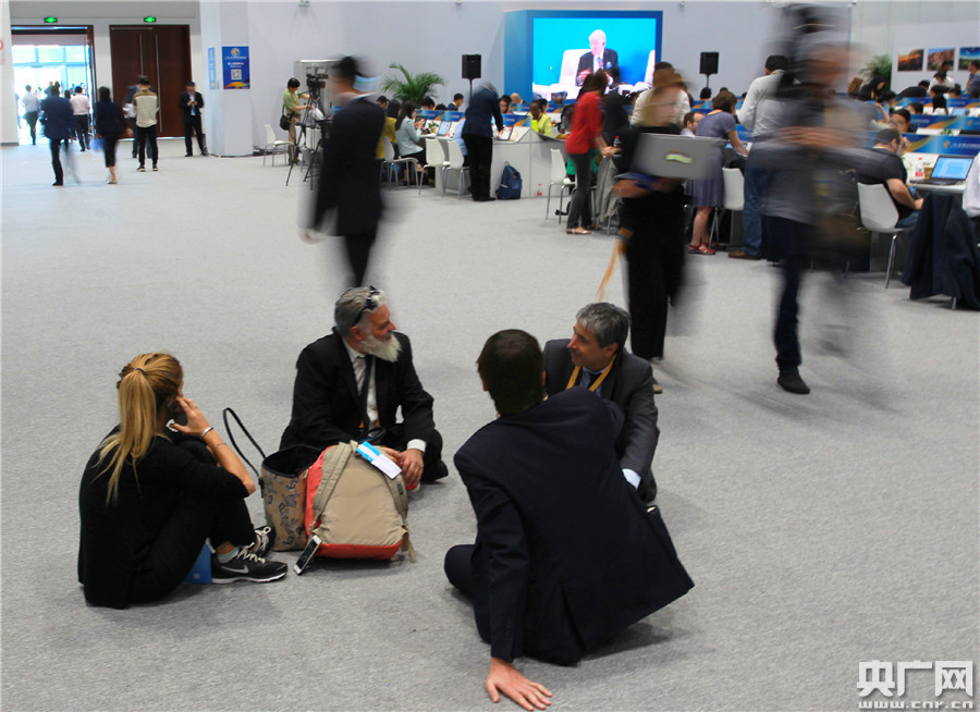 在“一帶一路”國際合作高峰論壇新聞中心內,記者們席地而坐,交流工作。(央廣網記者 韓靖 攝) -
