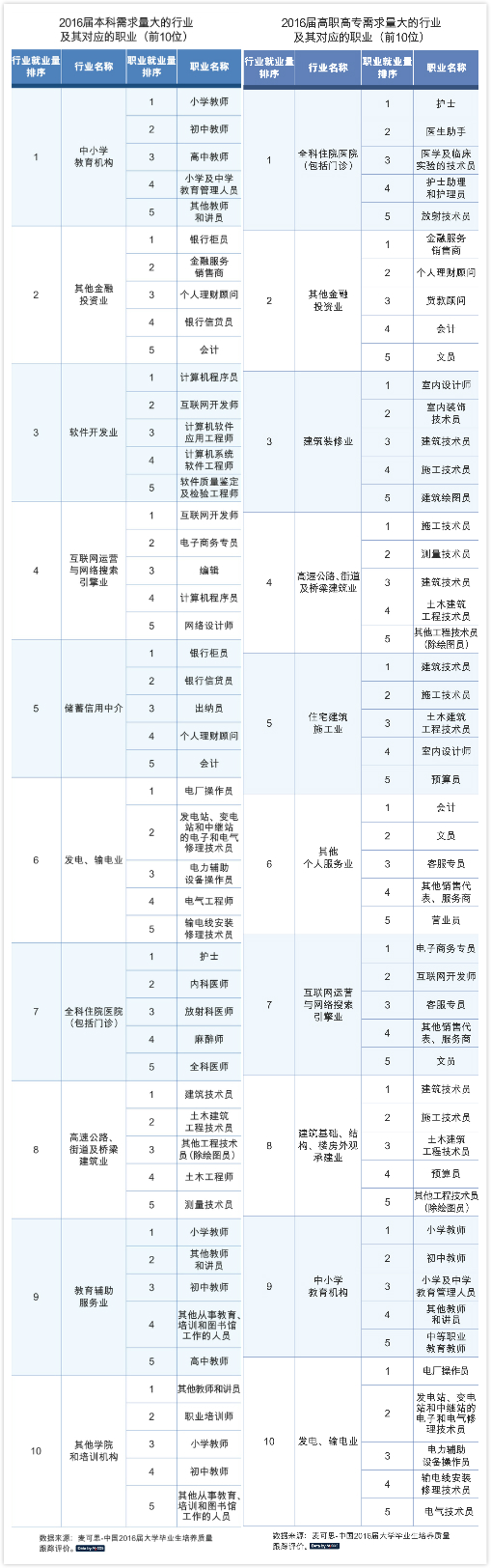 記者根據(jù)調(diào)查數(shù)據(jù)了解到,在對本科和高職高專畢業(yè)生需求量最大的前十個行業(yè)中,有六個行業(yè)是重合的,包括:“中小學(xué)教育機構(gòu)”“其他金融投資業(yè)”“互聯(lián)網(wǎng)運營與網(wǎng)絡(luò)搜索引擎業(yè)”“發(fā)電、輸電業(yè)”“全科住院醫(yī)院(包括門診)”“高速公路、街道及橋梁建筑業(yè)”。可見高職高專和本科需求量較大的行業(yè)存在一定的一致性。