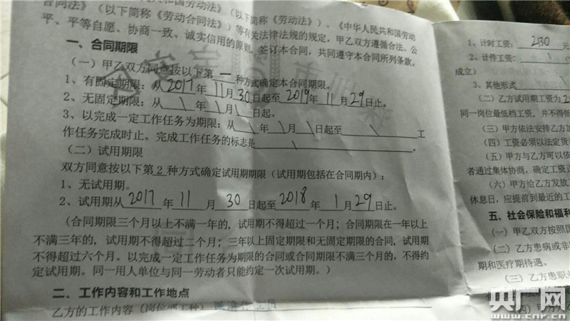 根據趙程提供的勞務合同照片,記者看到合同期限一欄明確寫有“有固定期限:從2017年11月30日起至2019年11月29日止。試用期限從2017年11月30日到起至2018年1月29日止!