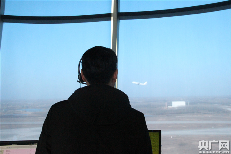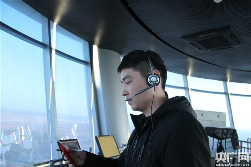 新橋機(jī)場(chǎng)塔臺(tái)管制員王俊俊指揮飛機(jī)起降(央廣網(wǎng)記者 高藝寧 攝)