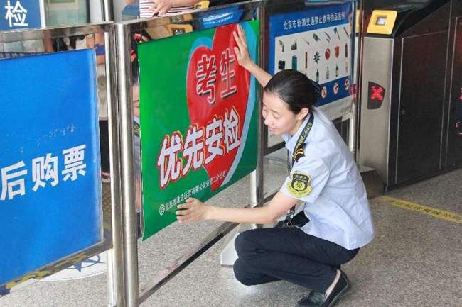 據北京地鐵相關負責人介紹,大部分車站均開辟考生“三優先”通道,為考生保駕護航。安檢區域實行“考生優先安檢”的措施,實行“考生優先進站”的措施,憑本人準考證從指定通道優先進站乘車。