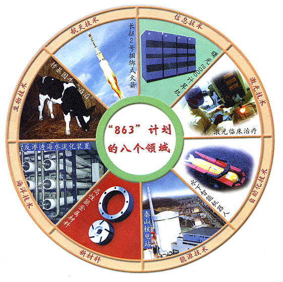 1986年3月提出的863計劃,在經(jīng)過一百多位科學家半年多的反復論證,形成為《863計劃綱要》,選擇生物技術、航天技術、信息技術、激光技術、自動化技術、能源技術和新材料七個領域作為我國發(fā)展高科技的重點,1996年又將海洋高技術列為計劃的第八個領域。