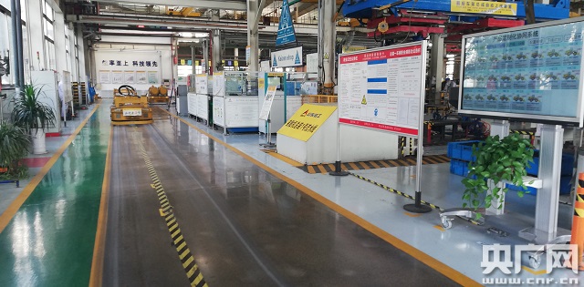 得益于此,車間每個班組都配備了裝配可視化系統。液晶顯示屏上顯示著組裝機器的實時力矩,它的旁邊還標有標準力矩供工人對照。在可視化系統的下方,一臺臺載滿組裝配件的AGV智能物流運輸車按照既定路線來回穿梭。AGV是臨工自主研發的,目前全廠共有130臺這種運輸車,已經完全取代了原有的76輛運輸叉車,每年為公司節省了2億的現金流,也大大提高了工作效率。山東臨工一號線生產經理戚興國說,以前裝載機車間平均一人一星期可以生產一臺,現在每人平均不到兩天就可以生產一臺裝載機。一系列“黑科技”的運用,讓臨工在新舊動能轉換的長跑中昂首走在了前頭。