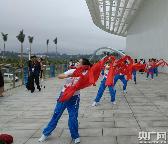 老年大學的阿姨們正在劇院外排練。 (央廣網記者 王笑蕾 攝)