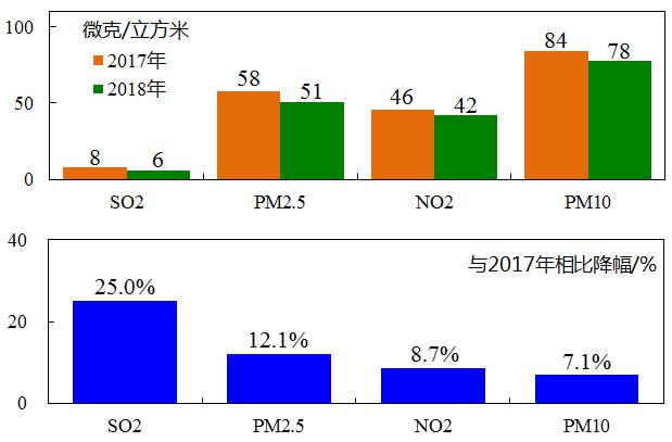 此外,二氧化硫、二氧化氮、PM10年均濃度分別為6微克/立方米、42微克/立方米、78微克/立方米,同比改善均較明顯,較2017年下降幅度分別為25.0%、8.7%、7.1%。其中,二氧化硫年均濃度連續兩年下降,達到國家標準,但二氧化氮、PM10仍分別超過國家標準5%、11%。