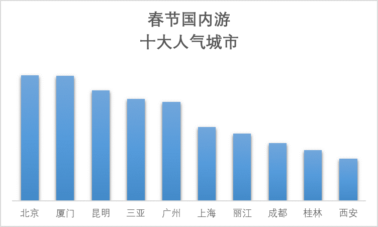 哪些國內旅游城市是今年春節的贏家?根據攜程跟團游和自由行數據,最受游客歡迎的國內旅游城市前十分別是北京、廈門、昆明、三亞、廣州、上海、麗江、成都、桂林和西安。