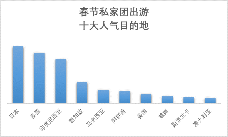 根據攜程私家團訂單數據,春節私家團出游十大人氣目的地依次為日本、泰國、印度尼西亞、新加坡、馬來西亞、阿聯酋、美國、越南、斯里蘭卡和澳大利亞。