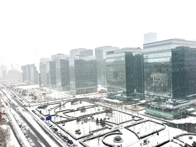 2月12日10時,北京豐臺科技園路面開始積雪。(央廣網記者 陳銳海 攝)
