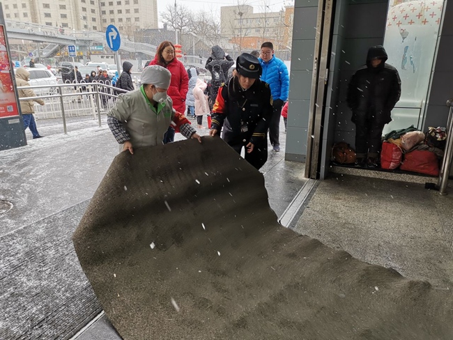 上午9點,隨著降雪的增大,北京西站地區管理委員會啟動了掃雪鏟冰應急響應。目前,地區物業管理部門和環衛部門正對南北廣場和北下沉廣場積雪、路面積雪進行清掃,并在車站門口鋪設防滑墊,保障旅客進出安全。