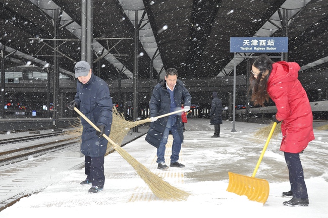 天津西站內,工作人員在清掃積雪。(北京鐵路局供圖)